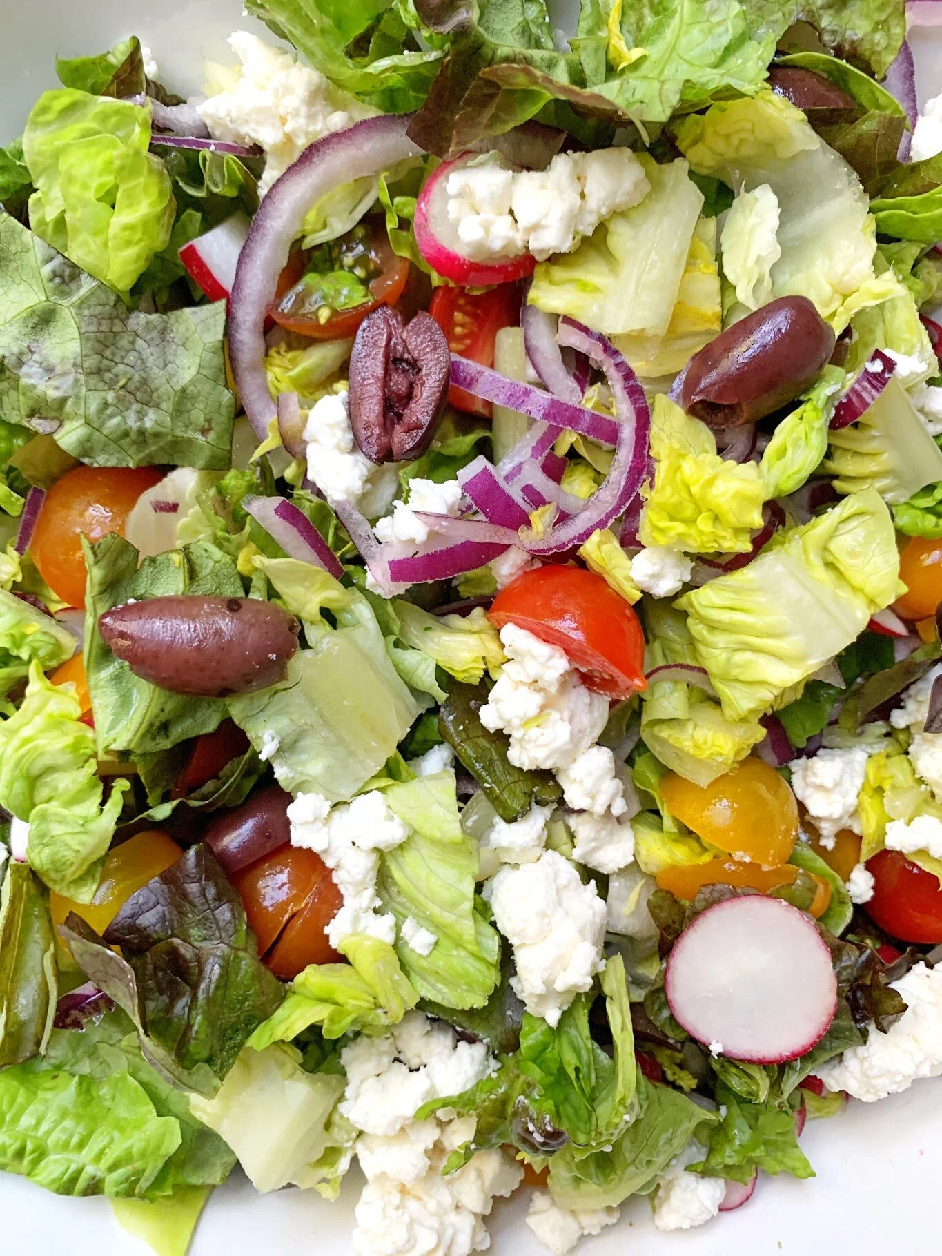In a large bowl, add lettuce, tomatoes, cucumber, olives, red onion, and radishes.